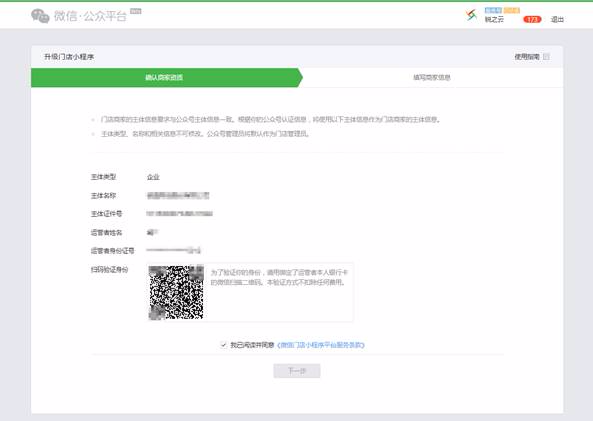 第一步、确认商家资质。门店小程序将复用你的公众号注册资质,请确认你的主体类型、主体名称、主体证件号、运营者姓名和运营者身份证号准确无误,并用绑定运营者本人银行卡的微信扫码验证身份。