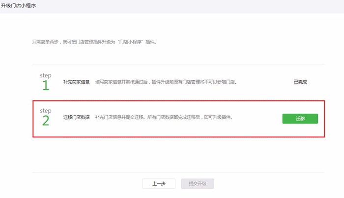 点击“迁移”按钮进行迁移,所有门店都完成迁移后,才可升级插件。