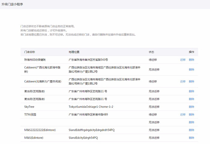 原有门店管理中审核通过的门店才可以进行迁移工作;原有审核不通过及门店地址位置已失效的均为无法完成迁移的门店,需要删除且插件升级成功后再重新添加。