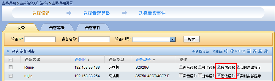 1、设置告警通知的短信通知功能。(详细步骤与邮件告警设置大致相同,只在选择设备时需要勾选上短信告警)