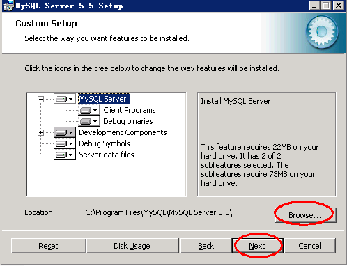 4) 安装向导显示安装目录选择界面(如下图所示),您可以通过点击“Browse…”浏览 选择MySQL数据库服务器的安装路径。选择MySQL数据库服务器安装路径后,点击“Next”按钮。请注意:不建议将MySQL数据库服务器安装在系统的磁盘分区下,请选择安装在其他磁盘分区下。