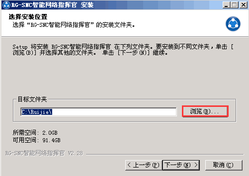 Files\Ruijie”,您可以通过点击“浏览…”按钮更改RG-SNC安装目录,选择安装目录后点击“下一步”按钮。提示:不建议将RG-SNC安装在系统的磁盘分区下,请选择安装在其他磁盘分区下。