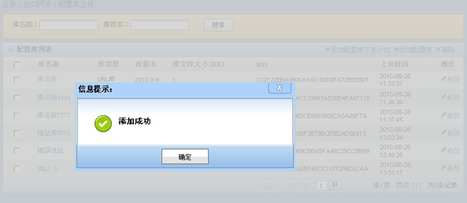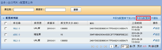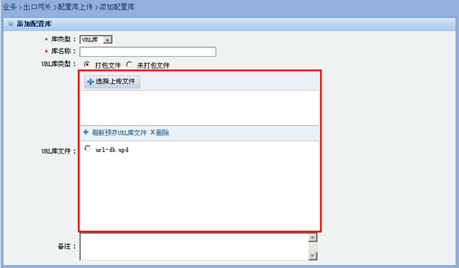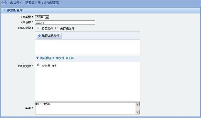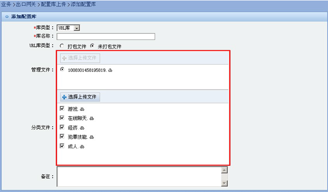 配置库包括URL库,地址库,特征库。URL库:网站分类库,区别用户访问的网站是属于新闻、游戏、股票、色情等;地址库:用于区别访问的服务器地址是属于电信还是联通等运营商的地址分类库;特征库:应用协议库,用于区别用户访问的是QQ、迅雷、HTTP、DNS等应用分类库。配置库上传主要是对配置库进行各种库文件上传、添加库信息、删除库信息、修改库信息等操作。