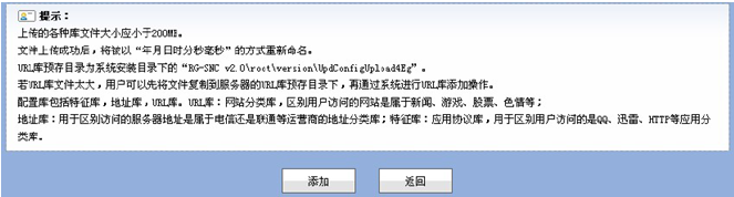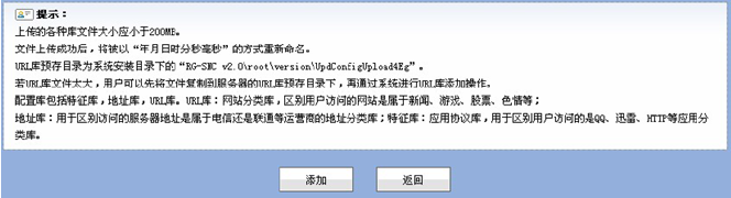 4.URL库预存目录为系统安装目录下的“RG-SNC v2.0\root\version\UpdConfigUpload4Eg”。若URL库文件太大,用户可以先将文件复制到服务器的URL库预存目录下,再通过系统进行URL库添加操作。