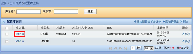 1. 在“配置库上传”页面,点击配置库列表中“库名称”链接,即进入该配置库的“配置库详细信息”页面。如下图所示: