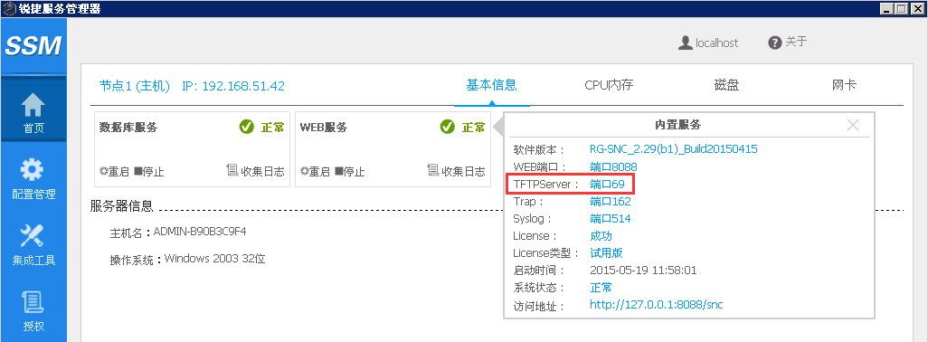 2、需要确保SNC的TFTP服务器地址正确(在安装时设置的,默认是本机地址)且TFTP服务正常启动,如下图:
