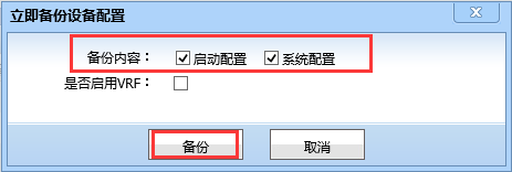 4)、在立即备份设备配置中选择备份内容以及是否启用了VRF后,点击“备份”。(启动配置就是设备的startup-config配置信息,系统配置就是running-config配置信息。)