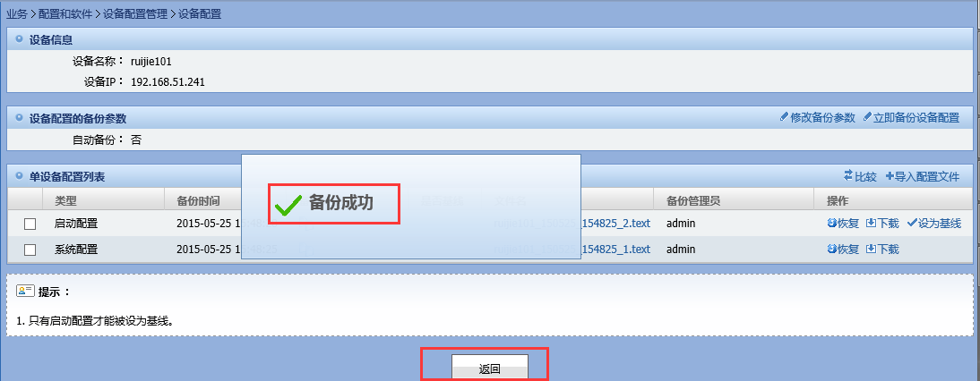 5)、配置备份成功后,如下图所示,界面将弹出“备份成功”的闪框,并在配置列表中会出现备份好的“启动配置”和“系统配置”。
