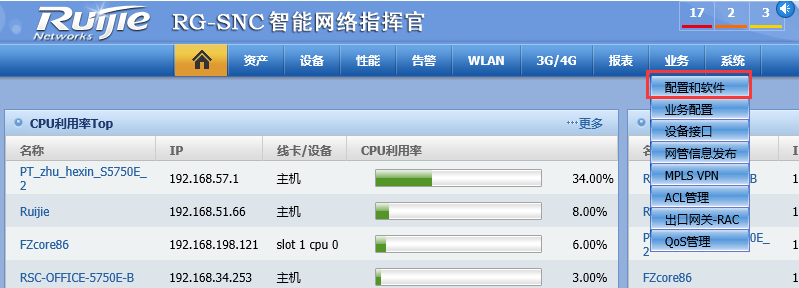 1)、将鼠标移到“业务”处,点击“配置和软件”。