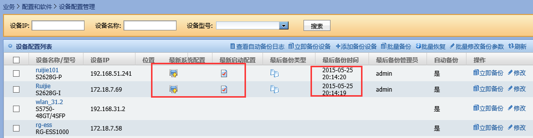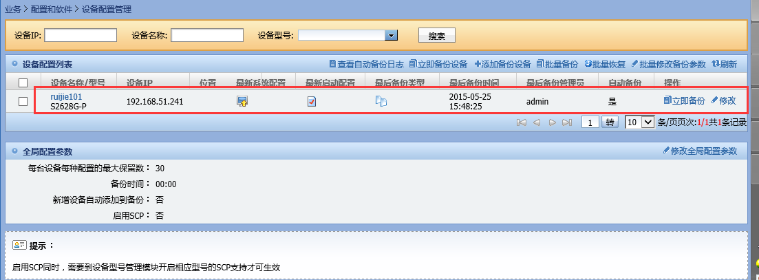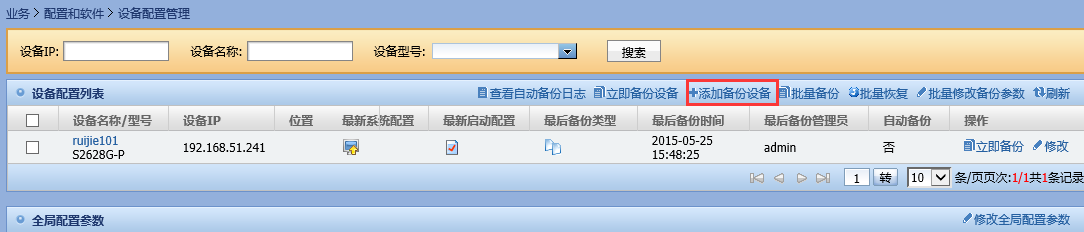 5)、添加成功会,自动返回到设备配置管理页面,可以看到刚才添加的自动备份的设备已经在设备配置列表中。