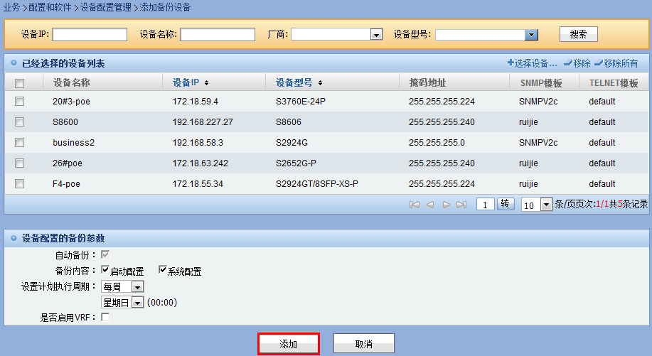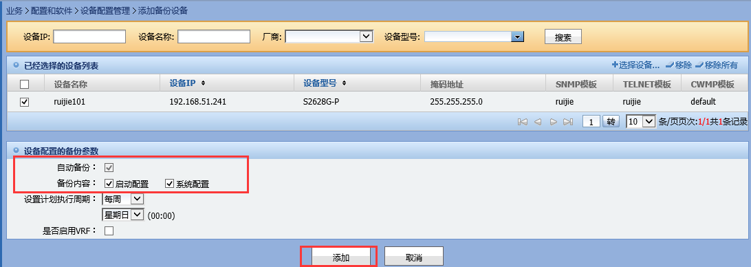 4)、跳转到添加备份配置页面,可以继续选择要自动备份的设备。设置好设备的备份参数后,点击”添加“。