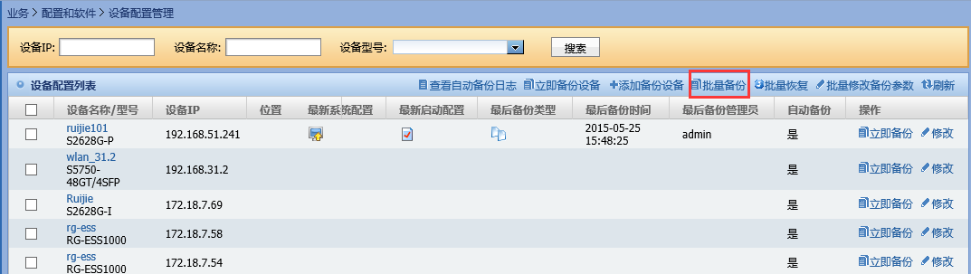 2)、在设备配置列表中选择需要批量备份的设备,然后点击”批量备份“。