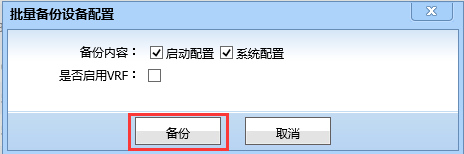 3)、在弹出的批量备份设备配置框中选择备份内容及是否启用VRF,然后点击”备份“。(启动配置就是设备的startup-config配置信息,系统配置就是running-config配置信息。)