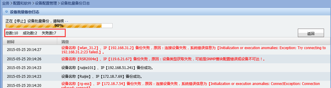 4)、自动跳转到设备批量备份日志页面开始备份,这里可以看到批量备份的详细情况如:备份成功、备份失败以及备份失败原因等。