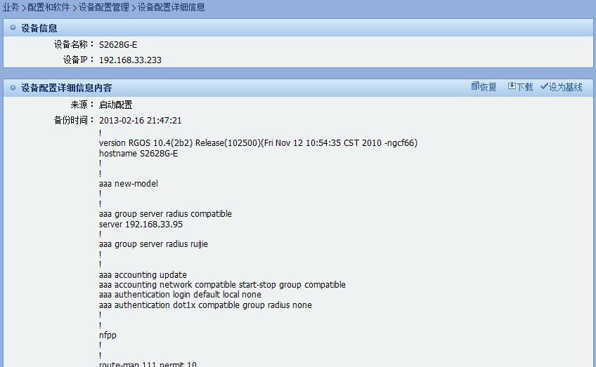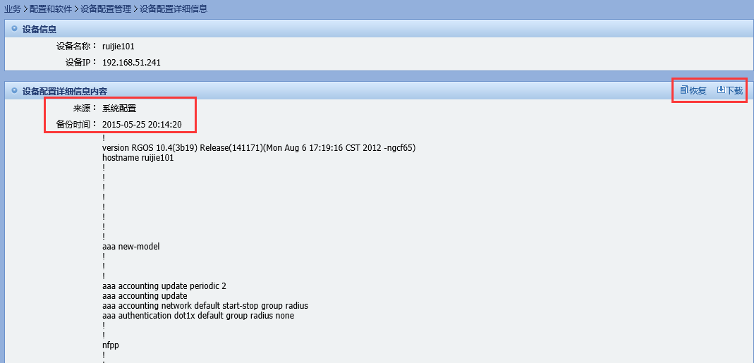 图标,可以查看到最新备份的系统配置,右上角设有“恢复”和“下载”按钮供管理员操作。
