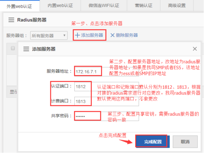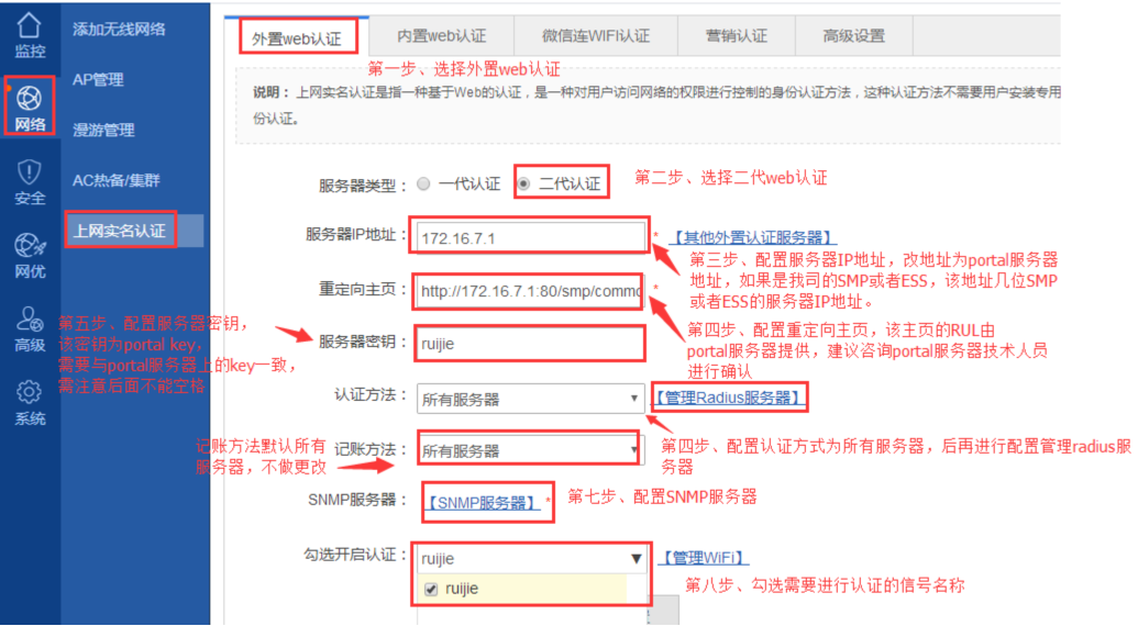 服务器上开启对应web认证功能,配置AC设备的IP地址,以及portal key秘钥,radius key秘钥,snmp key秘钥。添加对应的认证用户。
