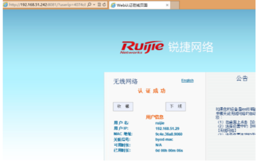 用户连接到无线网络,打开网页弹出认证界面,输入密码提示认证正常并且能正常使用网络。