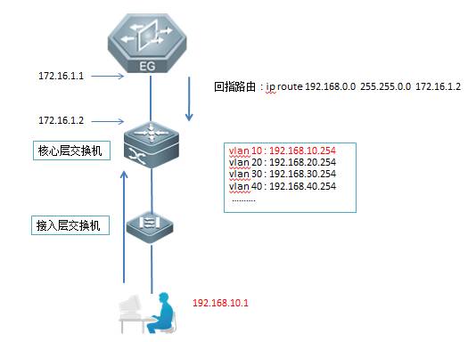 本用例以1台EG,1台核心交换机和1 台接入交换机为例说明配置过程。要点如下:
