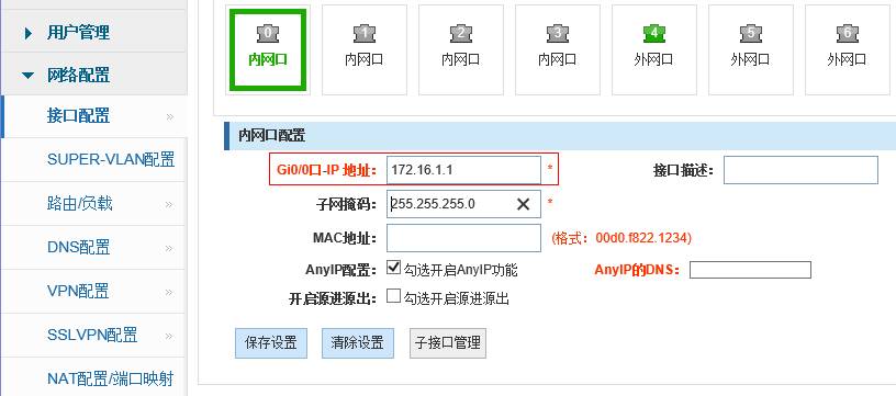 1、点击网络配置---->接口基本设置 ,设置内网接口的IP地址(设备在运行的情况,如果要修改内网口IP地址,不建议通过“快速配置”对内网接口IP地址做修改,避免其它误操作导致之前已经选定并配置好的流控方案丢失)。