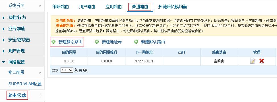 2)建议在以太网链路,配置静态路由的时候,配置为下一跳的ip地址,若是在网络出口配置默认路由,切勿配置为本地出接口,正确配置如下: