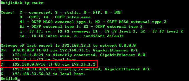 ip route ,能看到一条标号为“S”的静态路由