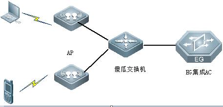 该场景是指网关EG350设备与AP之间通过非网管交换机(傻瓜交换机)相连,AP通过供电器供电,无线终端网关等均在EG350上,如下图。