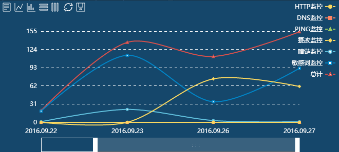 (1)监控统计:图表以不同颜色分别显示http监控,DNS监控,ping监控,篡改监控,暗链监控,敏感词监控以及总监控事件的数量。默认为折线图展示,可自行切换展示方式并保存图片。