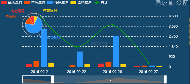 (2)漏洞统计:以不同颜色显示监控出的高危,中危,低危WEB漏洞和告警漏洞以及漏洞总计的情况,默认为柱形图展示可自行切换展示方式并保存图片。