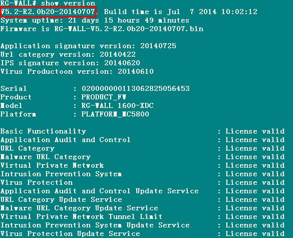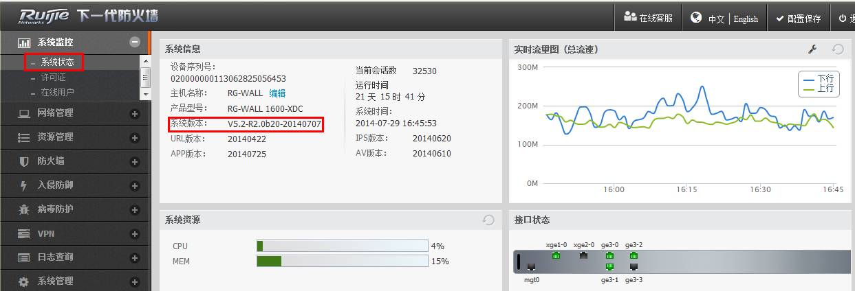 进入设备的“系统管理”--“状态”--“系统状态”,可查看设备当前的软件版本,如下图所示:软件版本的最后8位为版本的发布日期,从中可判断版本的新旧,例如下图中的版本为R2.0系列基线版本(b为beta版;p为补丁版本),2014年7月7号发布。,请联系在线客服或通过热线电话4008111000索要最新版本并升级。