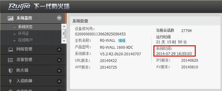 进入设备的“系统管理”--“状态”--“系统状态”,查看系统时间与当前时间是否一致,若系统时间不准确则将导致系统日志生成时间不准确。