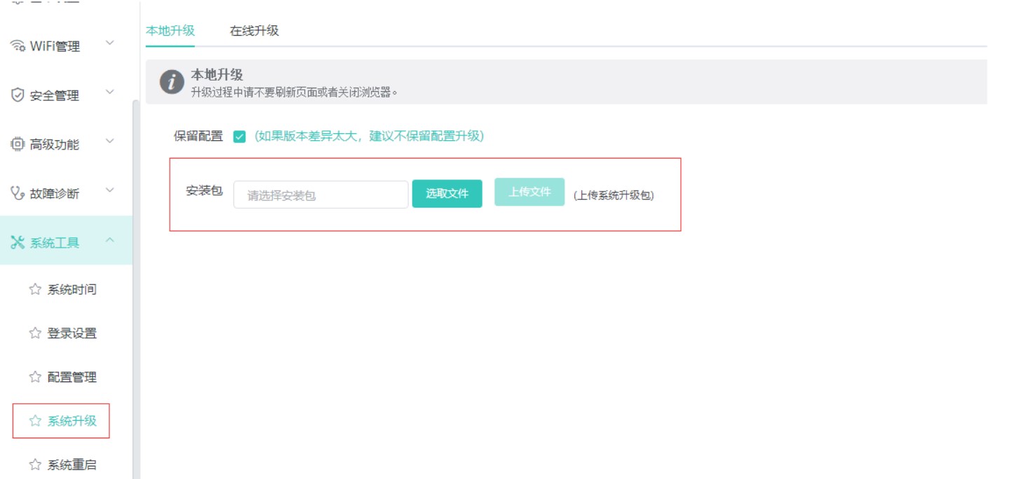 a、点击系统工具--->系统升级--->本地升级,以“选取文件“方式选择本地电脑的升级文件”xxxxtar.gz“,点击 “上传文件“,其中勾选”保留配置“,则会保留配置,若未勾选,则原先配置会丢失,界面如下图所示: