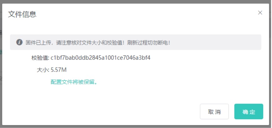 b、软件版本上传成功后会提示校验值以及大小,点击确定后设备会重启,重启完成及完成升级。