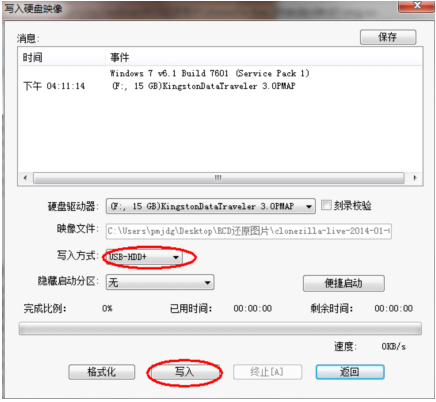 2、选择菜单栏的“启动”写入硬盘映像,出现如下窗口,写入方式选择USB-HDD+,然后点击写入按钮,会跳出提示框显示U盘上数据将丢失,是否继续,点是,开始进行刻录(U盘数据会被格式化)