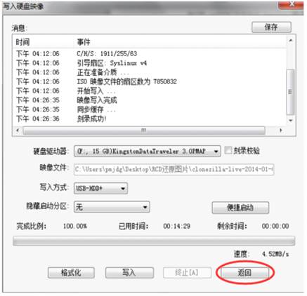 3、刻录完毕后如下所示,点击返回,完成刻录,拔出U盘。