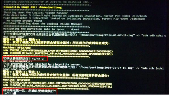 6、在启动过程中出现两次提示,将对系统硬盘进行覆盖,输入“y”并回车。然后系统进入还原过程: