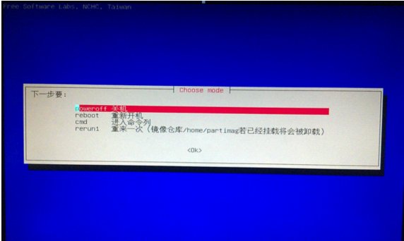 7、系统还原完毕,如下如下菜单,选择关机菜单并回车。系统关机,完成系统安装: