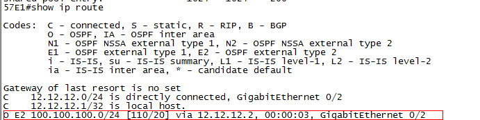 在上面的环境拓扑中,要在57E1上将100.100.100.0这个OE2条目过滤,可以用distribute-list过滤路由: