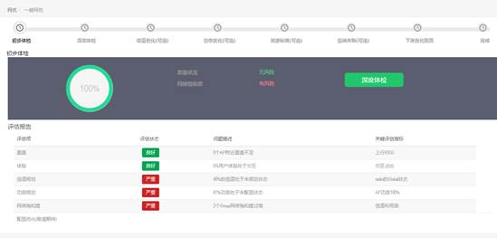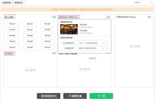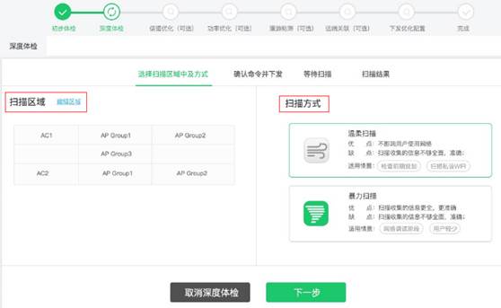 初步体检-> 深度体检->信道优化->功率优化->漫游粘滞->远端关联->下发优化配置->完成查看效果