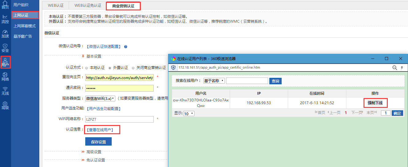 登录到设备上,【用户】——【上网认证】——【商业营销认证】——【查看在线用户】中可以单独针对某个在线用户踢下线或者全部踢下线。