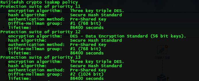 1. sh crypto isakmp policy(查看第一阶段的参数)。如下图主要是encryption+hash+dh
