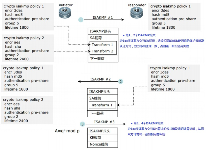第1、2个ISAKMP报文 用于交换并协商保护ISAKMP消息的安全参数以及对等体验证方式,包含加密算法、验证算法、验证方式、ISAKMP