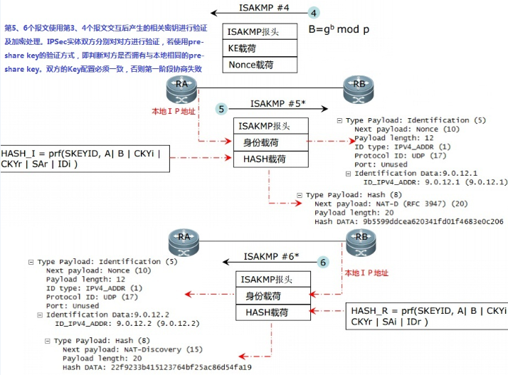 6、RB收到第5条ISAKMP报文后,首先对消息进行验证再解密,RB会使用RA发送的身份载荷,并与本地存储的信息一起进行HMAC计算,得到一个HASH值,再与RA发送的HASH载荷进行比较,如果不相等,则会中断协商过程。