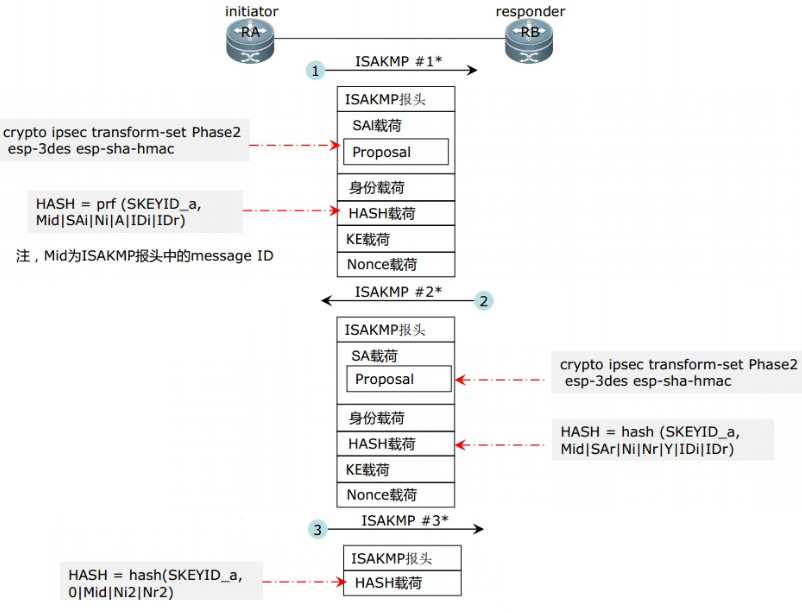 第二阶段 快速模式 (quick mode ) 交互3个ISAKMP报文(协商IPSec SA)