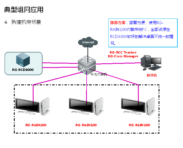 1、使用RG-Rain100代替传统PC主机,更易于维护和降低能耗;简单干净的系统极大提高了使用的稳定性,学生端调用的硬件资源采用UCD的资源减轻客户端的硬件投入。