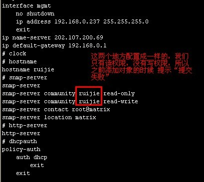 只读和读写属性的团体字都被改成ruijie,如果这两个地方配置一样的话,设置只有读权限,无写的权限,所以导致之前添加对象的时候提示“提交失败”。 当客户端启动的是这个startup-config