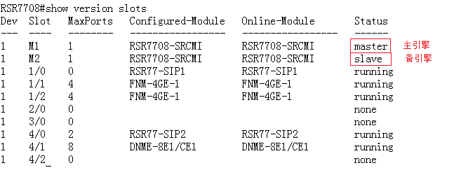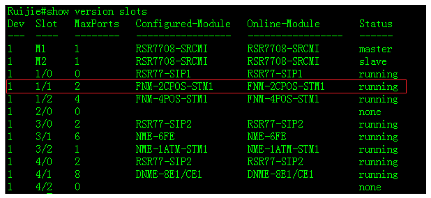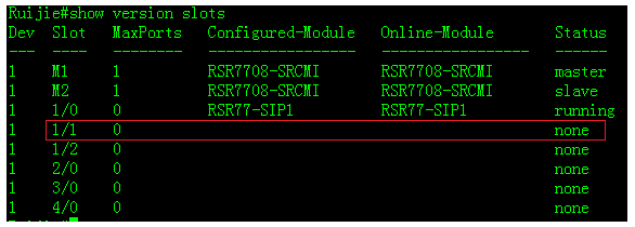 b、RSR77系列路由器,通过show version slots 确认设备是否正确识别到线卡。若show version slot显示线卡的状态为running,则设备正确识别到该线卡,线卡工作正常。