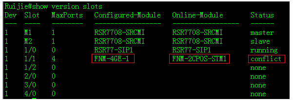 slot 查看线卡的状态,若线卡的状态为conflict,设备Configured-Module装载的线卡和Online-Module插入的物理线卡不一致。