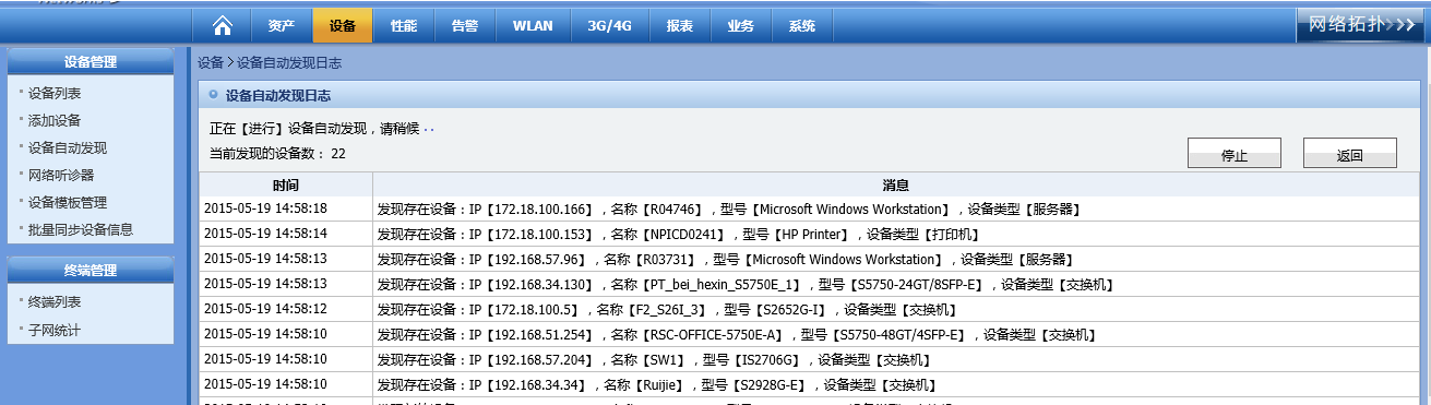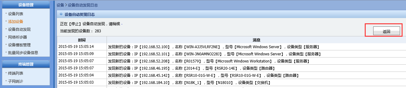 自动发现完成后,单击“返回”进入设备页面可以看到通过自动发现的网络设备列表