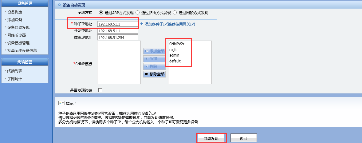 2、在“设备自动发现”页面,填写拓扑发现需要的种子IP地址、开始IP地址和结束IP地址,选择进行自动发现使用的一个或者多个SNMP模板,完成后单击“自动发现”