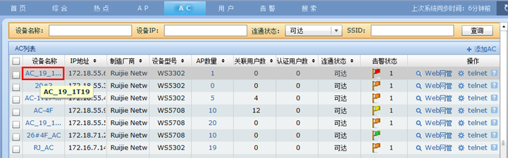 1. 在AC列表中点击“设备名称”,打开AC详细页面,如下图所示: